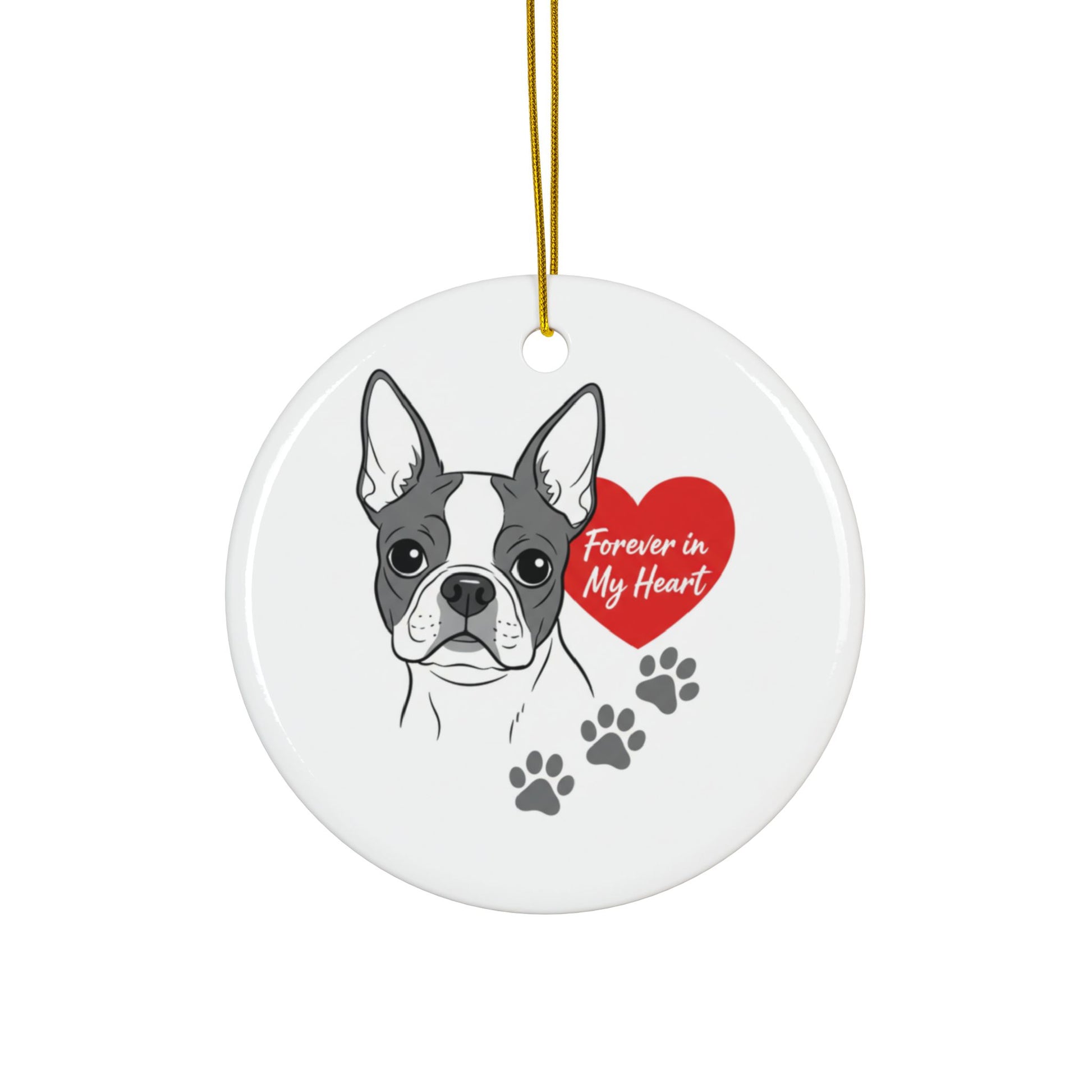 This ceramic ornament captures quiet, heartfelt remembrance in a small, glossy keepsake. The front features a lovingly illustrated Boston Terrier with a red heart and paw prints, while the reverse remains pristine—ready for your own note or another design. Hung by the included gold string, it brings a gentle, personal touch to trees, memorial corners, or window displays. Durable ceramic and vivid, full-color printing keep the artwork bright year after year, and multiple shapes and bundle sizes let you mix designs for family members who share the same fond memory.